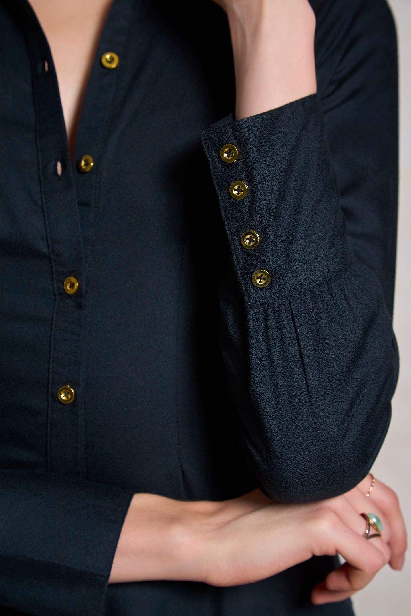 Features A Turn-Down Collar And Full Sleeves With Cuff.