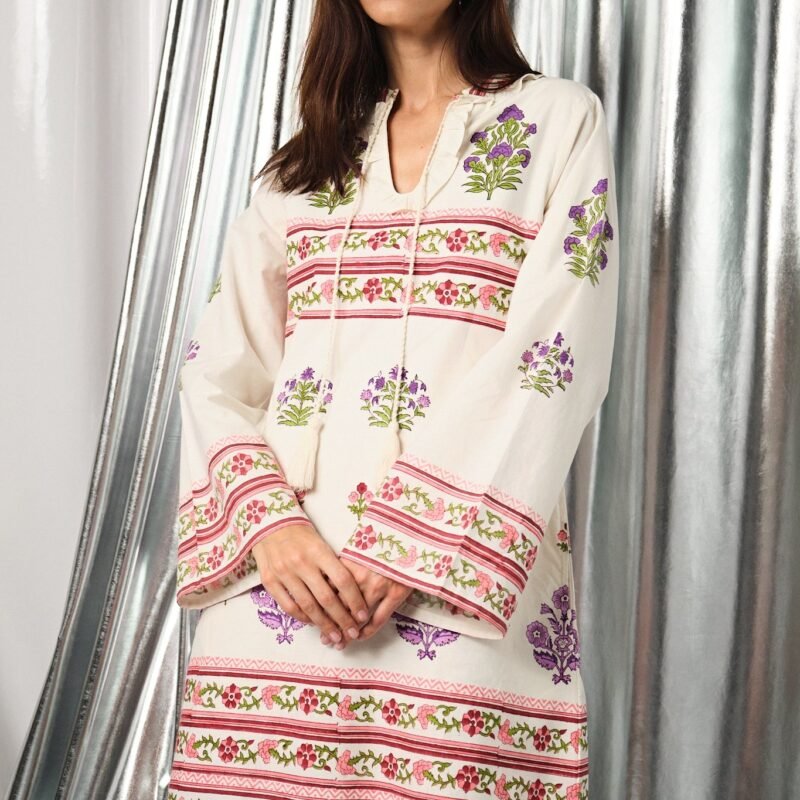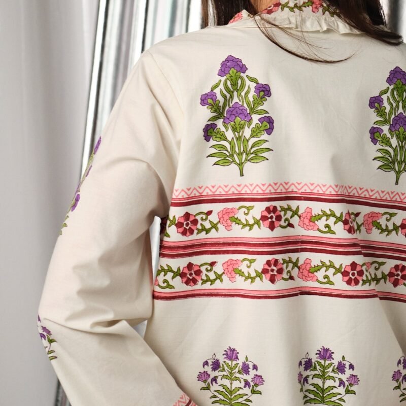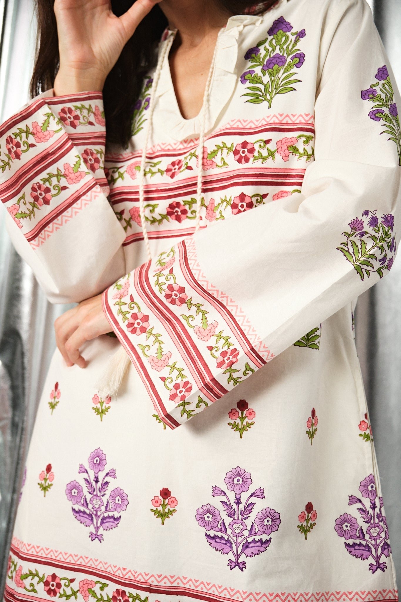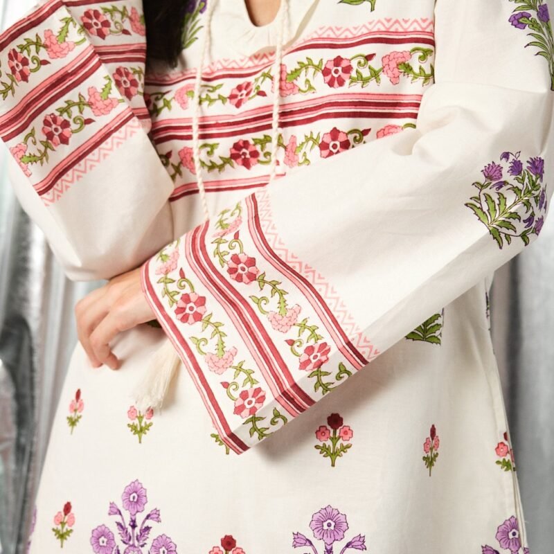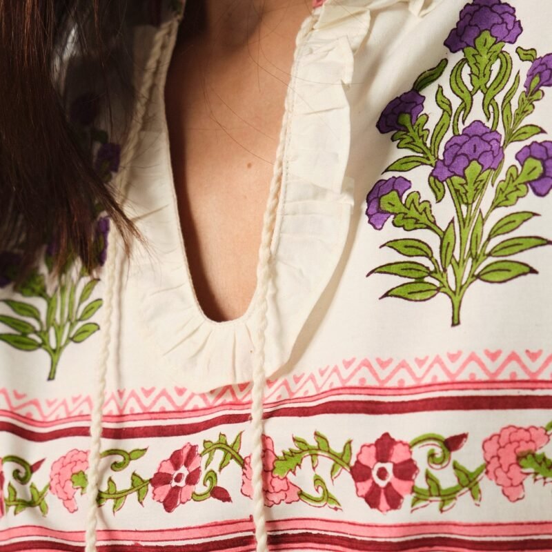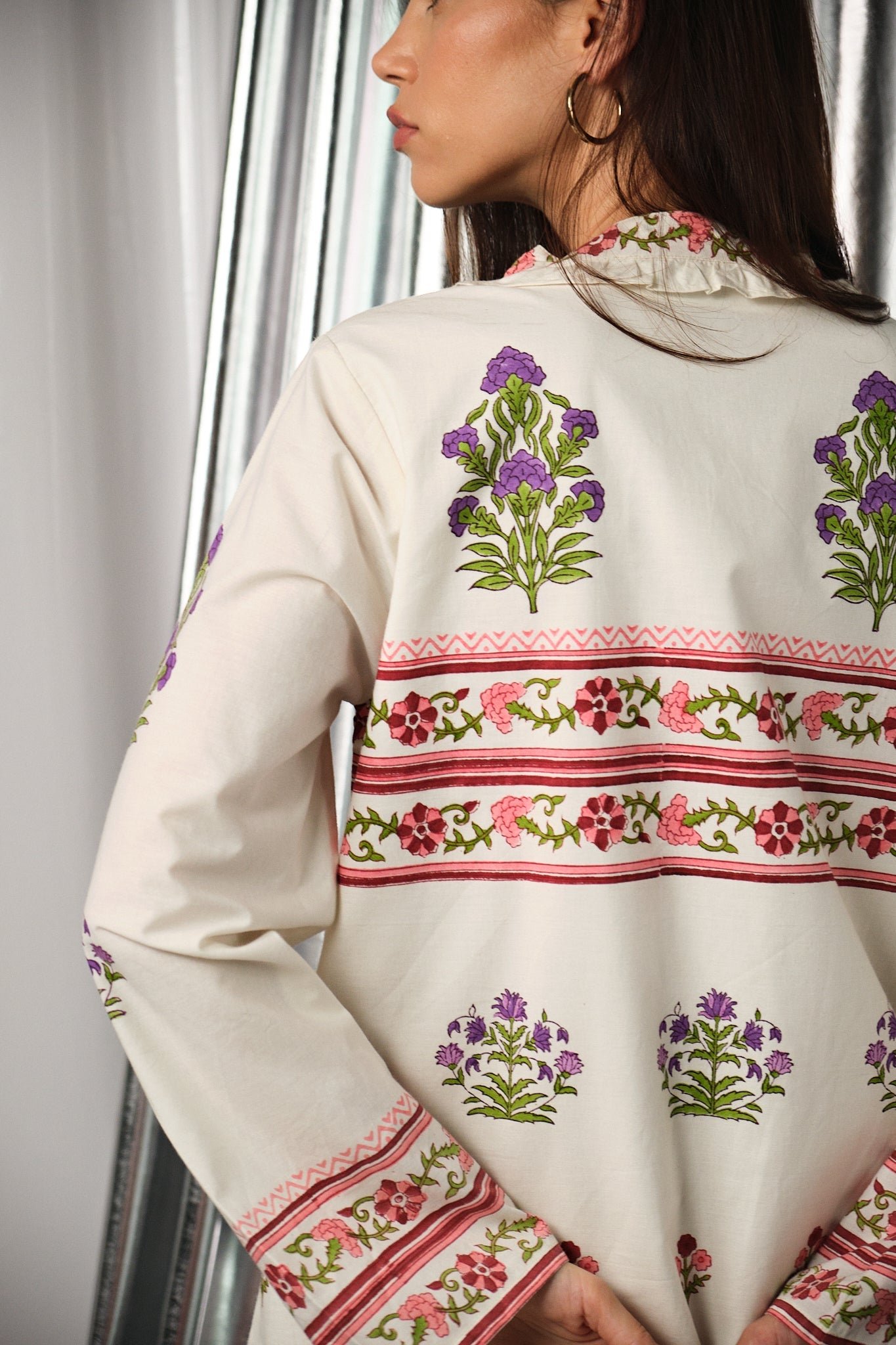 White Jaipur Hand Block Print Dress With Full Bell Sleeve And Ruffle Neck