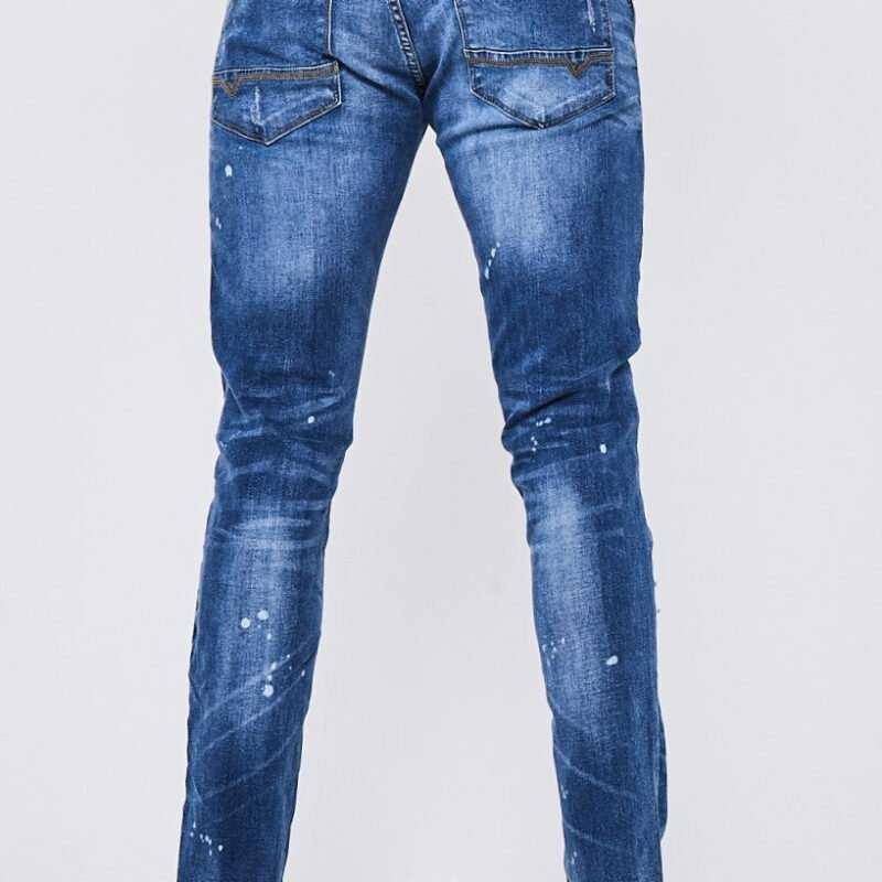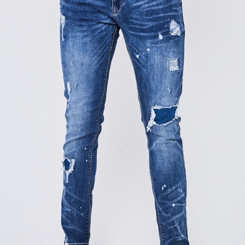 These taper fit jeans in a stylish mid blue are perfect for a casual yet fashion-forward look. The stretch denim provides comfort, while the cotton rich fabric adds quality. With a distressed and ripped design, along with a trendy paint splatter detail, these jeans are a must-have for any wardrobe.