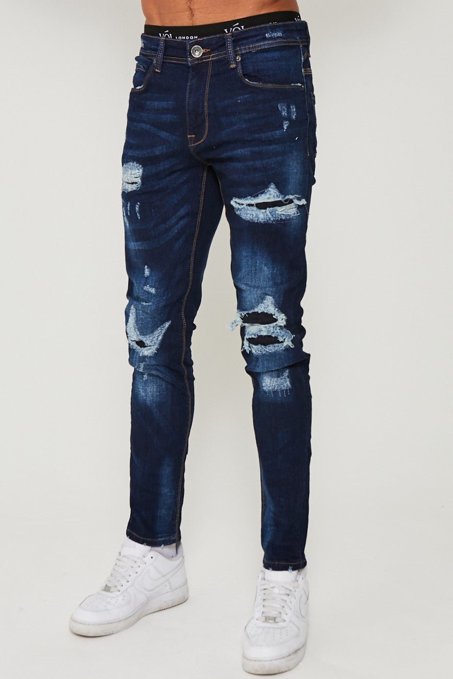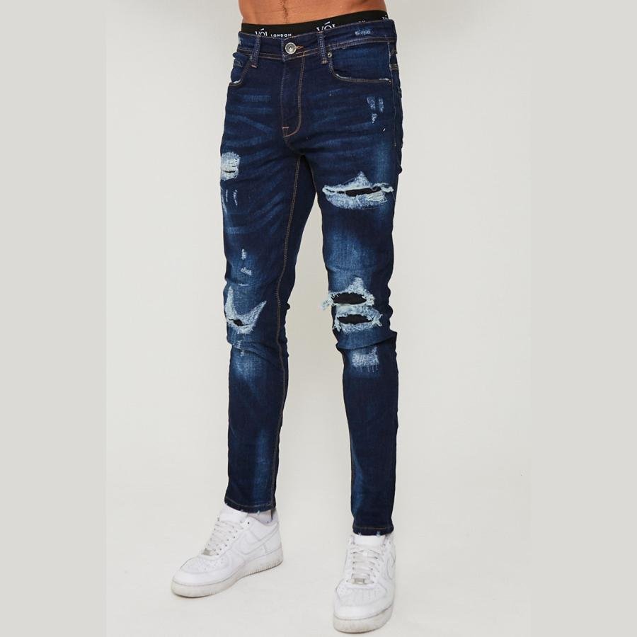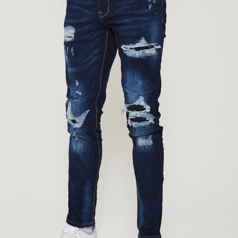These Taper Fit Jeans in Dark Blue offer a stylish and comfortable option for casual wear. Crafted with stretch denim for ease of movement, these jeans feature a distressed, rip & repair design for a touch of uniqueness. Made with a cotton-rich blend, these jeans are both fashionable and comfortable.