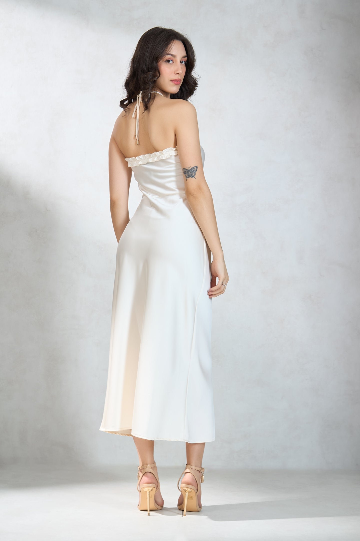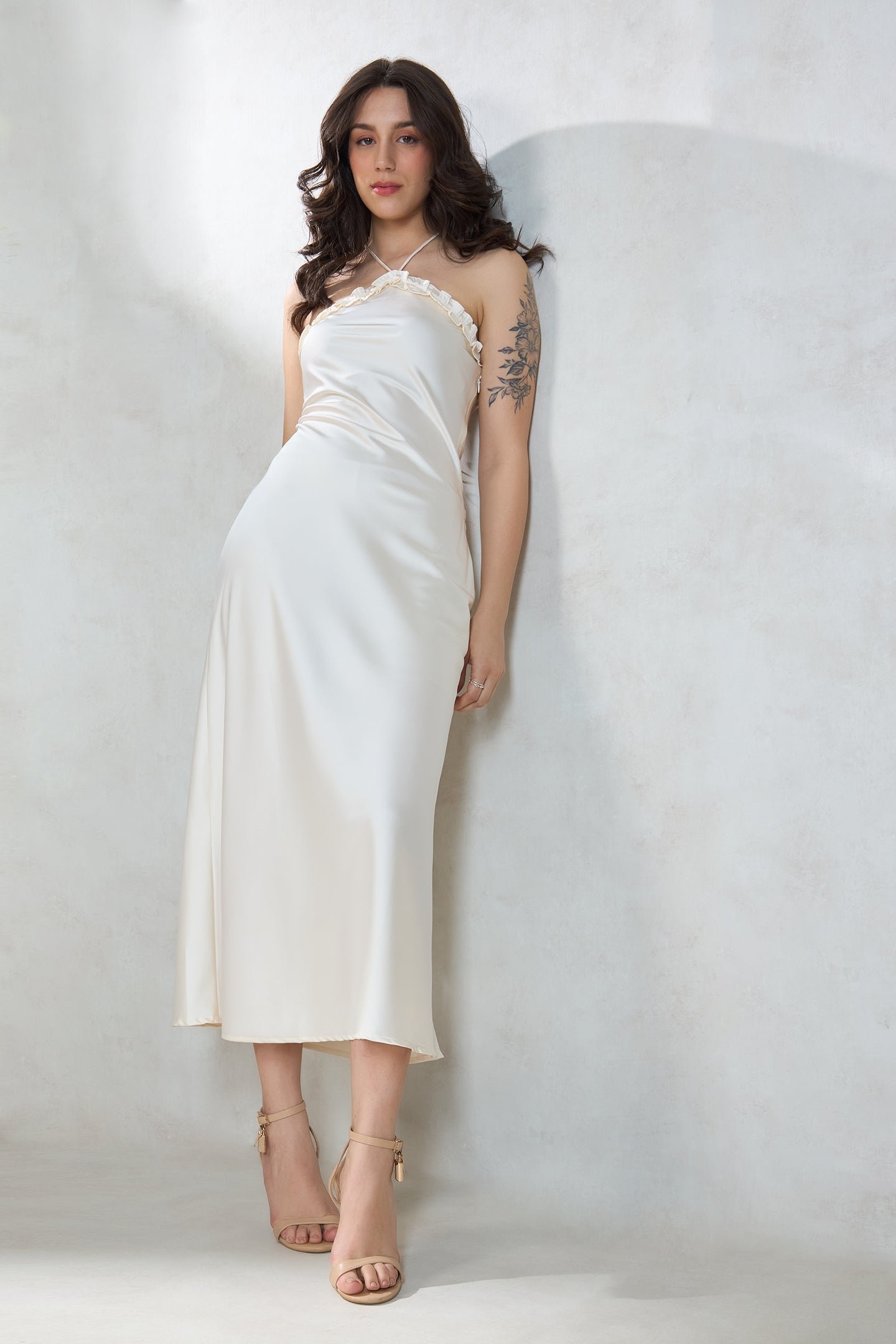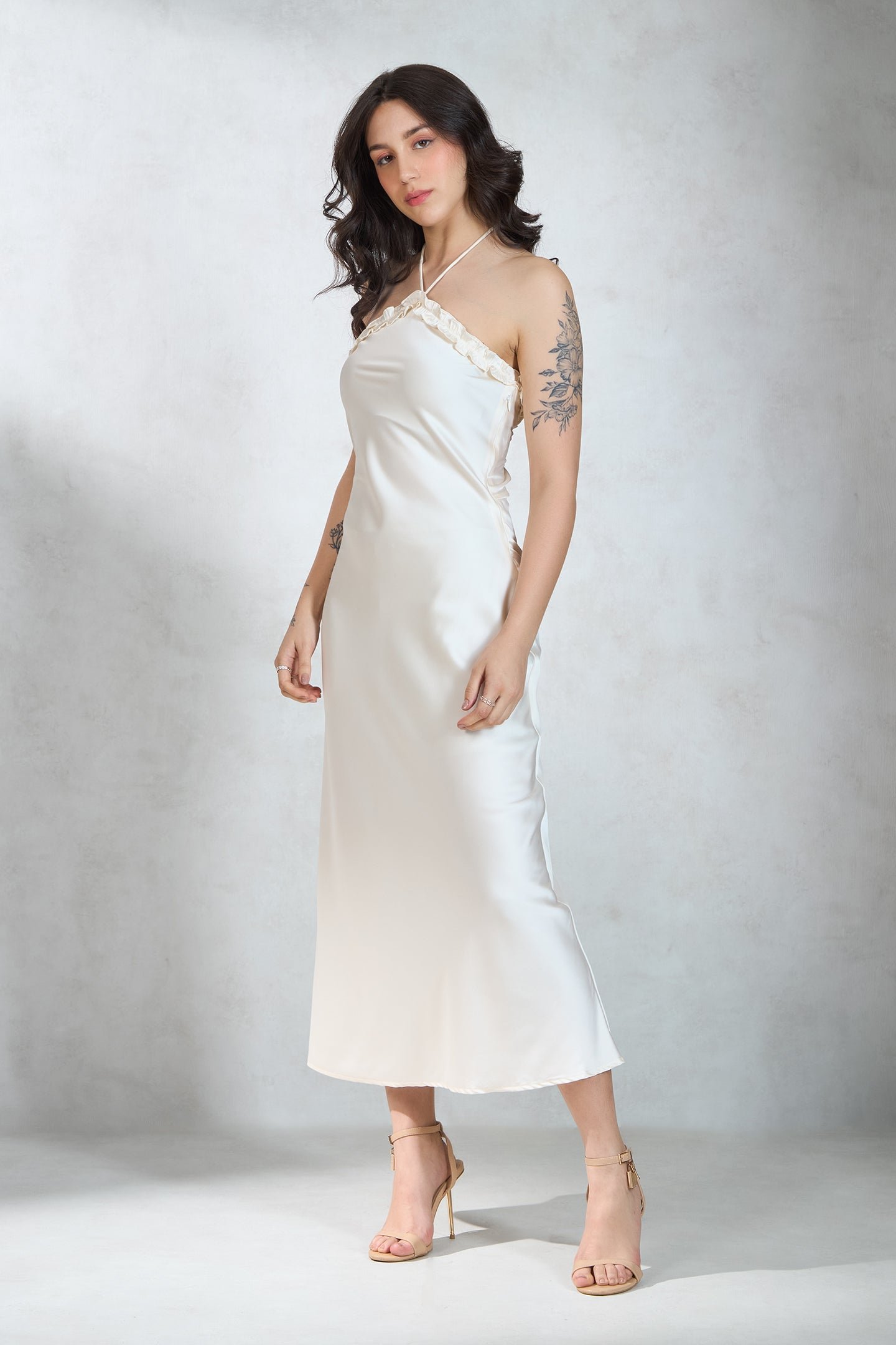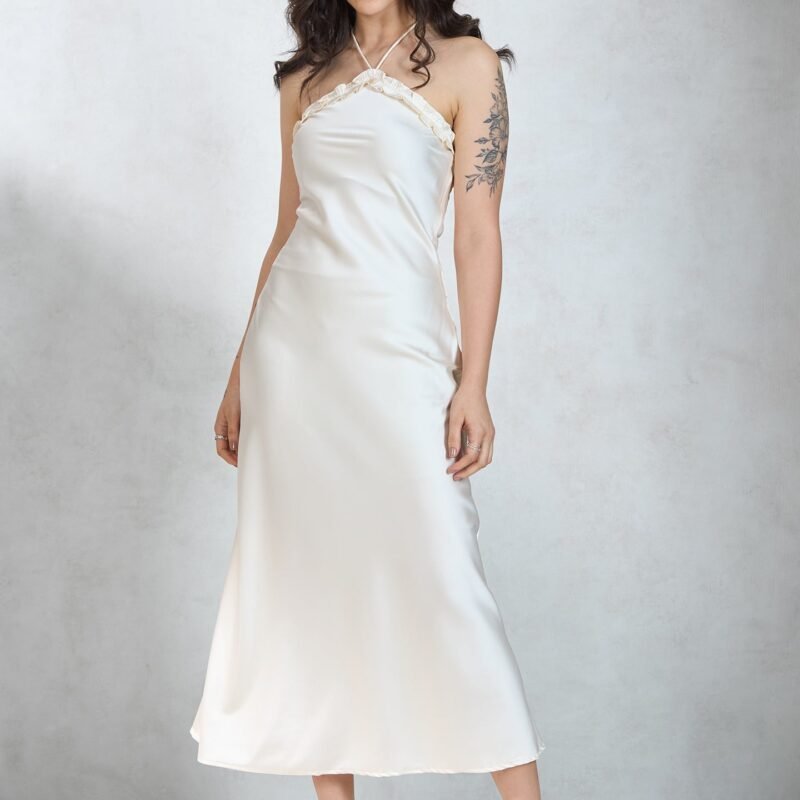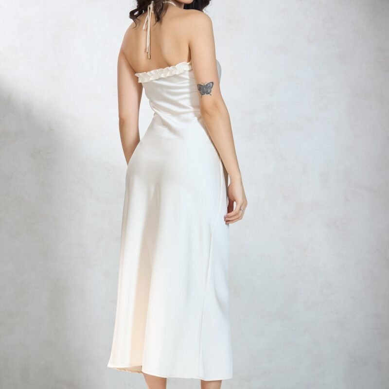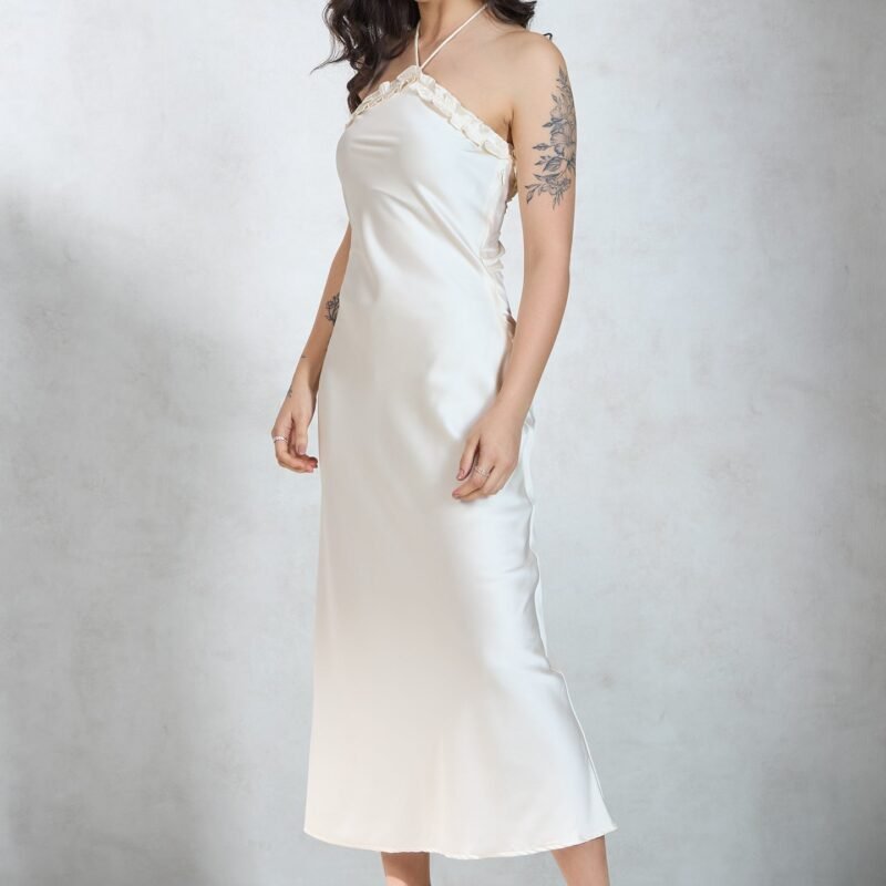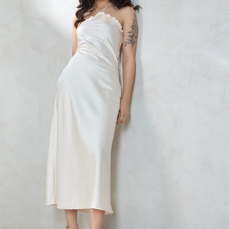 Slips Into Elegance With Halter Neck, Sleeveless, And Maxi Length.