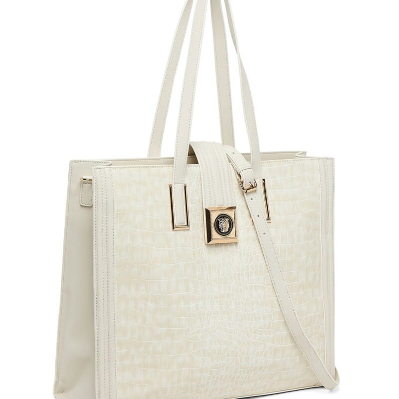 Elevate your everyday style with this stunning white croc-embossed tote bag, designed for the modern woman who appreciates sophistication and timeless luxury. Crafted with a structured silhouette, this handbag showcases a striking gold Medusa emblem at its center, complemented by sleek double handles for effortless carrying. Spacious enough to fit your essentials — from documents to daily accessories — this bag is your perfect companion for work, meetings, and weekend escapes. A true statement piece that blends elegance with functionality.